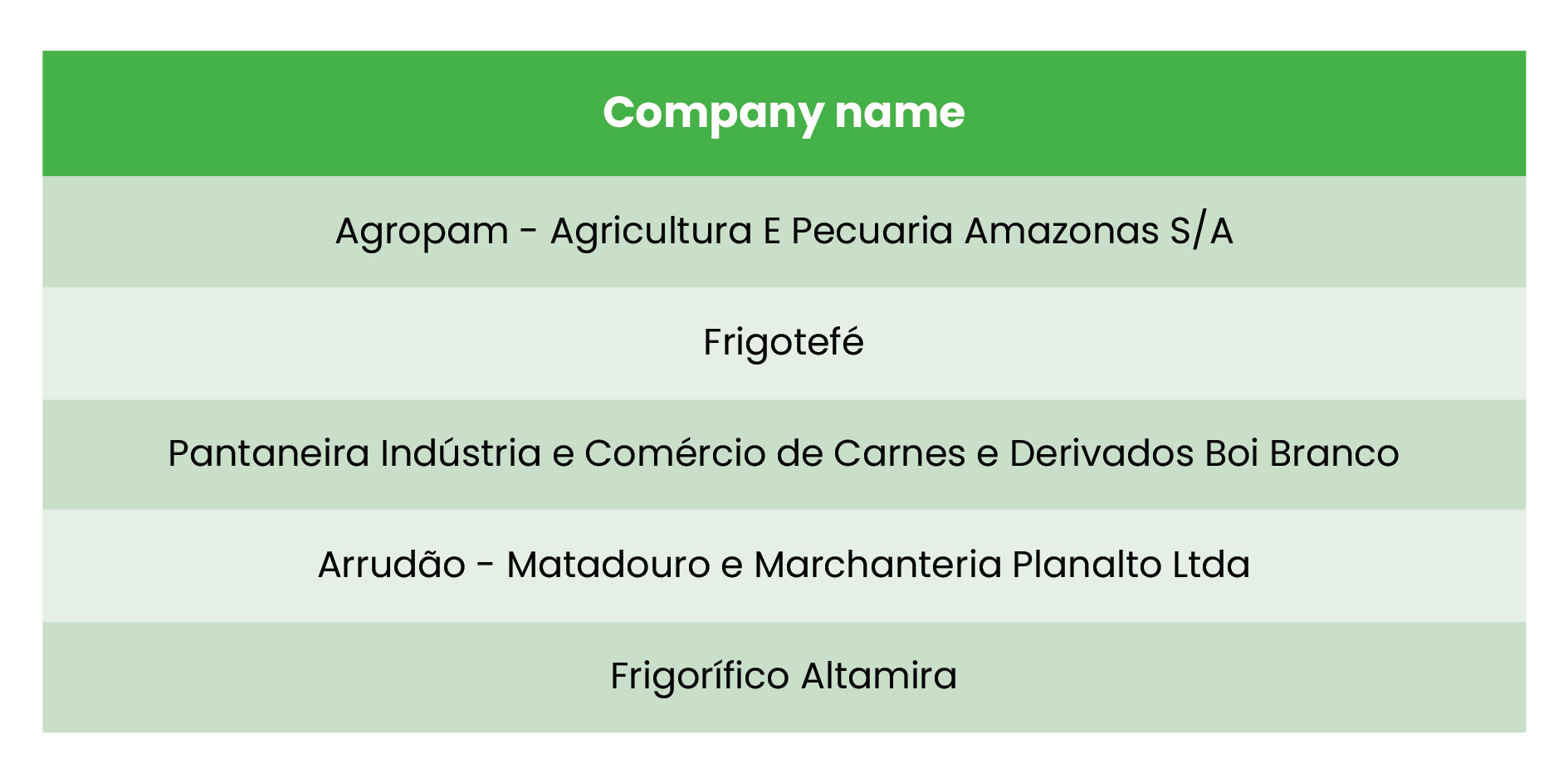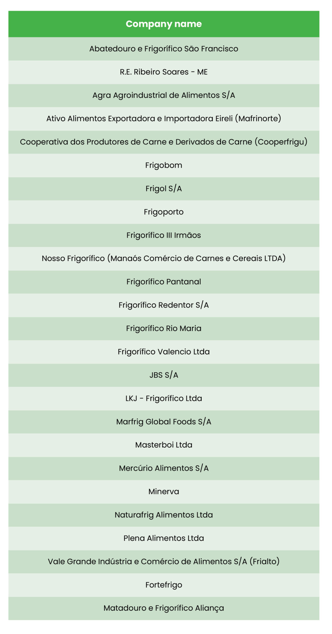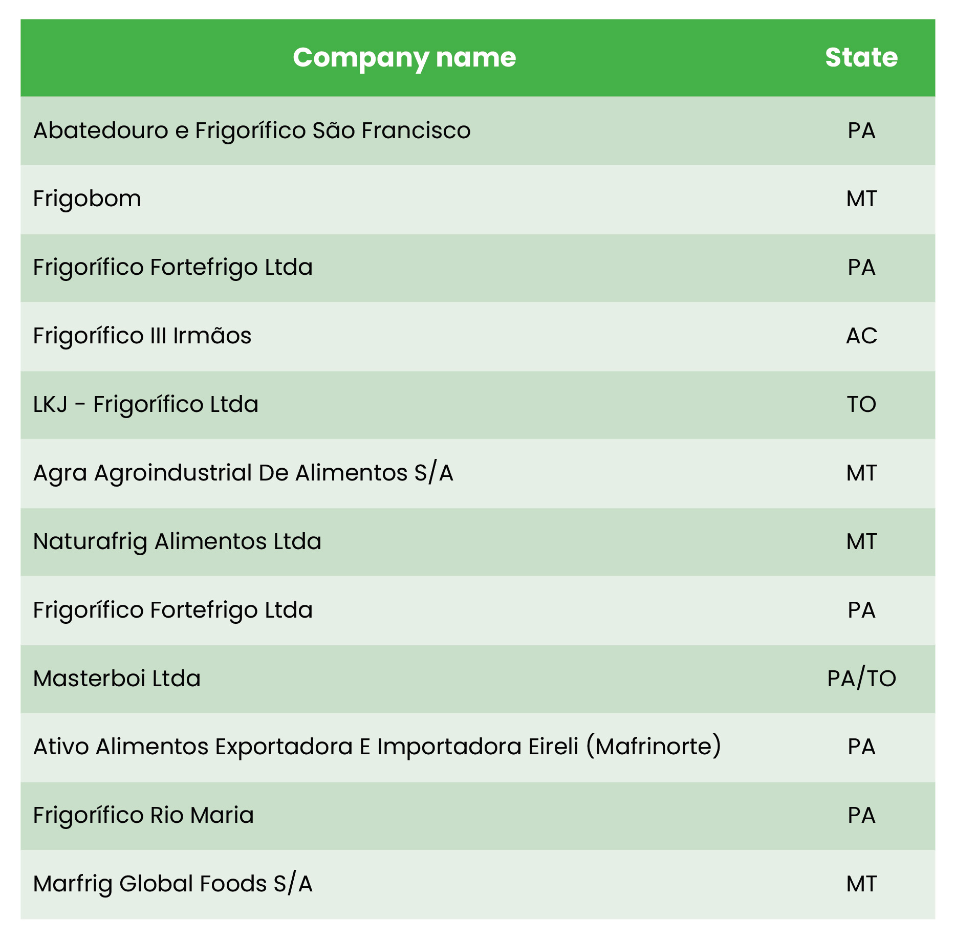 The following tables list meatpackers according to the type of audit conducted on their cattle purchases in the Legal Amazon.