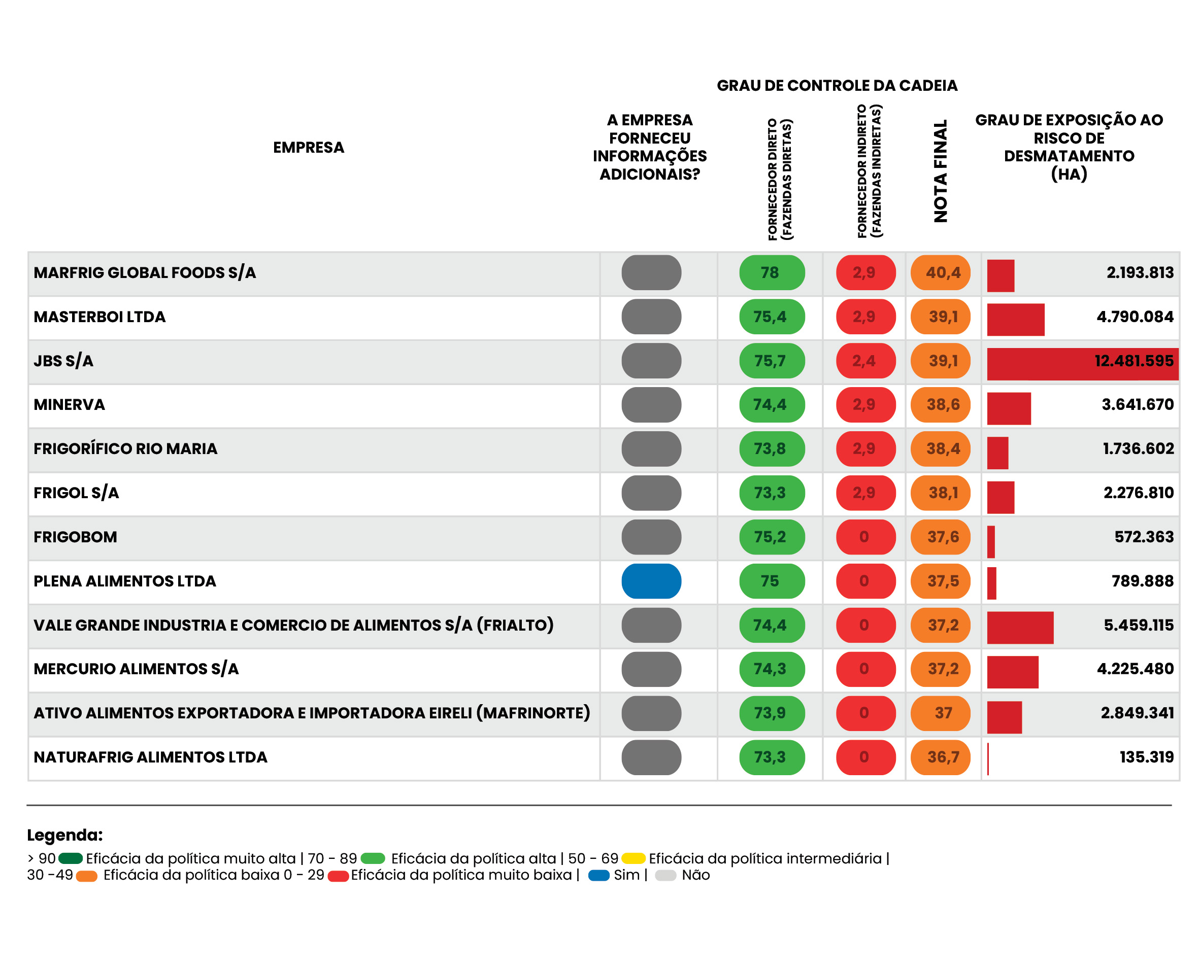 Doze empresas, que detinham 41% da capacidade de abate em 2024, apresentaram o maior grau de compromisso e controle sobre os seus fornecedores, a partir da consulta de seus dados públicos. As empresas Marfrig, Masterboi e JBS lideram esse ranking.