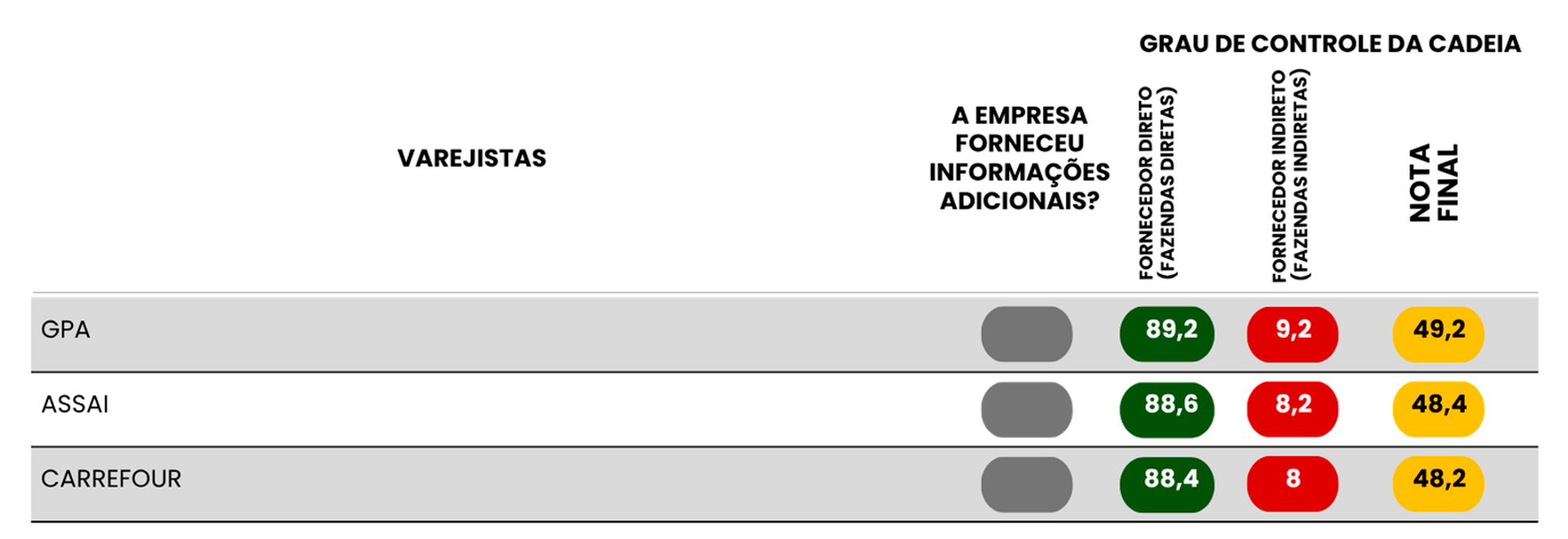 GPA, Assaí e Carrefour foram os varejistas que obtiveram os melhores resultados com base na análise de dados públicos (Tabela 1). Entre os 76 varejistas com sites ativos, apenas três (Assaí, Carrefour e GPA) declararam realizar auditorias em fazendas fornecedoras diretas conforme informações disponíveis em seus próprios sites. Já o varejista MundialMix foi o único a responder ao questionário enviado pelo Radar Verde. Embora a empresa tenha feito isso de forma voluntária, demonstrando um engajamento louvável, ela não enviou documento que comprove a existência e a prática de uma política socioambiental. Desta forma, obedecendo à metodologia da pesquisa, as questões não puderam ser pontuadas.